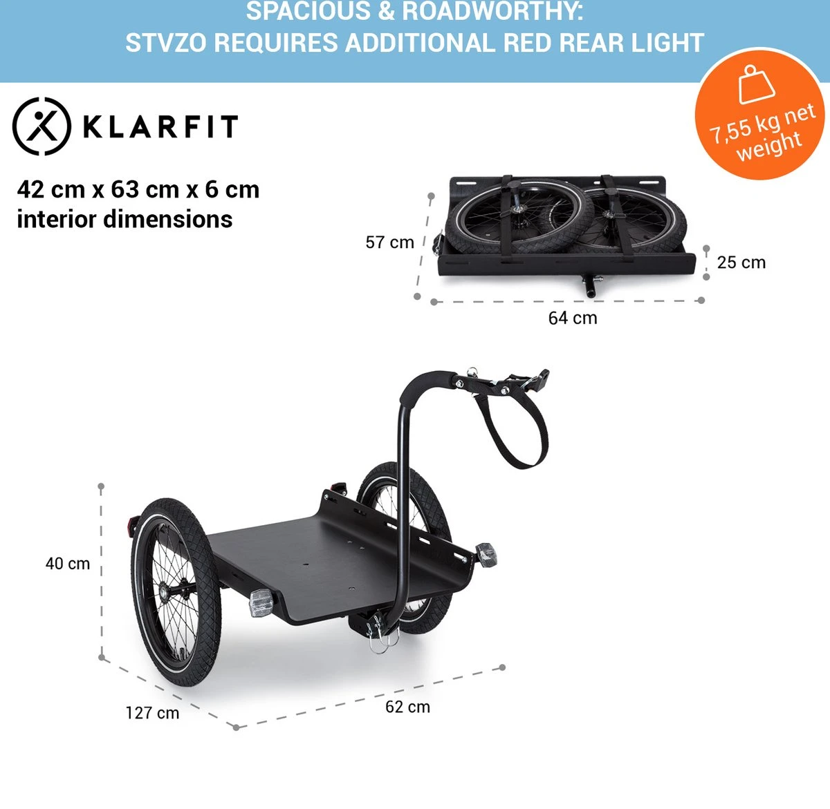 Moeiteloos vinden koffers, kratten, zakken met aarde of een complete campinguitrusting een plaats in de 50 liter grote laadruimte van de Klarfit Cargo Bull Travel fietsaanhanger, met een oppervlak van 42 x 63 cm. De aanhanger, met zijn stabiele bak van 1 cm dik multiplex, kan tot 40 kg belast worden. De meegeleverde, scheurvaste spanriemen worden aan beide zijden in vijf houders gespannen en zorgen voor een veilig, slipvrij vervoer van de goederen. Het gebruik per fiets of met de hand wordt bepaald door de positie van de trekstang. Met twee borgpennen wordt die met slechts enkele handgrepen als hoge duw of lage trekstang gepositioneerd. Een uitklapbare standaard zorgt voor een stabiele stand van de eenassige wagen. Voor het hoge rijcomfort zorgen de 16″ wielen met schroefloos steeksysteem en de dikke 1,95″ banden. Voor de nodige zichtbaarheid in het verkeer zorgen twee rode en twee witte reflectoren.