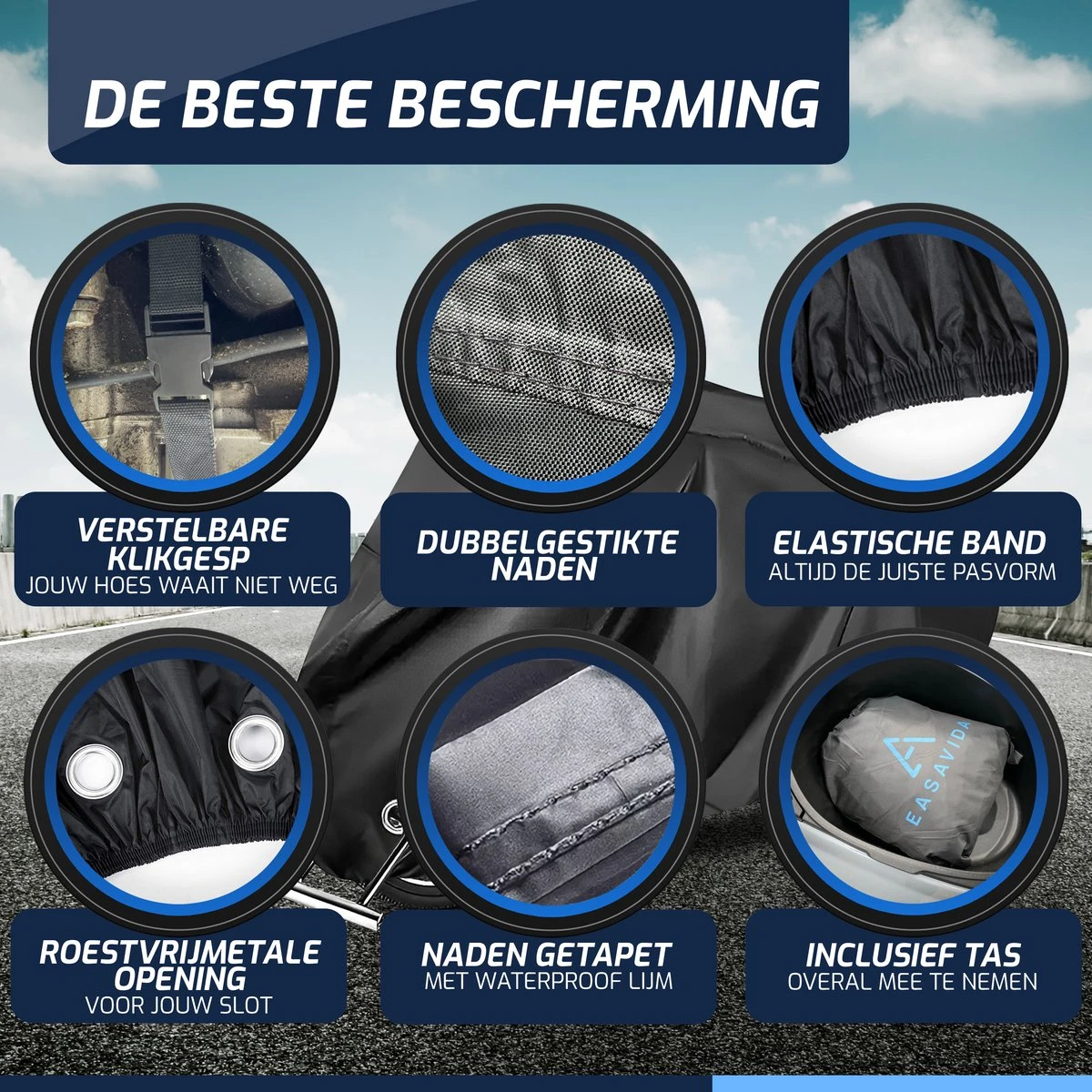 * Altijd de juiste pasvorm – Doe de hoes over jouw voertuig en de elastische band aan de voor- en achterkant doet de rest. Dankzij de band zal de hoes de pasvorm aannemen van jouw voertuig. De verstelbare kliksluiting aan de onderkant, zorgt ervoor dat de hoes niet zomaar meegenomen kan worden door de wind.