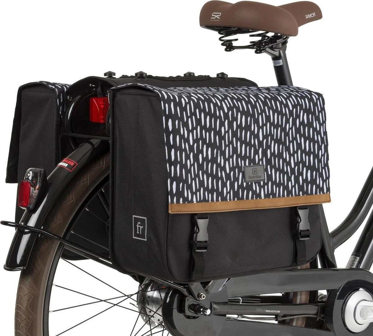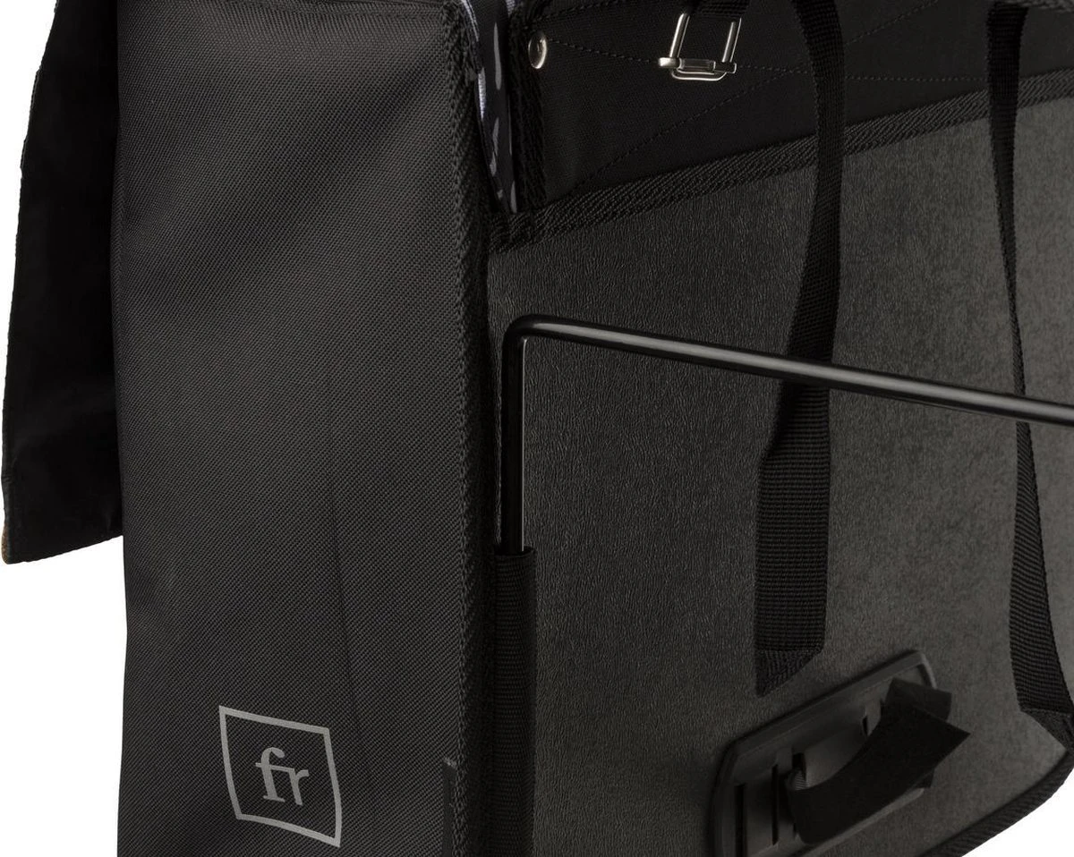 De Fastrider Nara Dubbele Fietstas biedt een betrouwbare mix van fris eigentijds ontwerp en hoge functionaliteit. De regenflappen en het waterafstotende materiaal houdt je bagage droog in nat weer, en de reflectieve prints verzekeren een goede zichtbaarheid in het donker. Deze ruime tas is een uitstekende keus voor e-bikes en maakt bovendien gebruik van het stabiele MIK systeem voor de bevestiging.