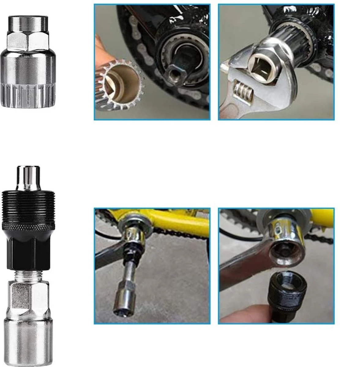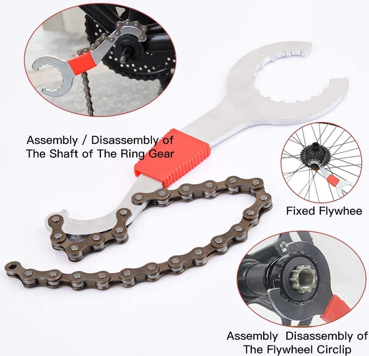 - 【3-in-1 tandwielsleutel met ketting】Het wordt voornamelijk gebruikt voor het monteren en verwijderen van de geïntegreerde luchtgeleidingsas met schroefdraad. Als je het vliegwiel demonteert, bevestig het dan zodat het niet draait. Met de set van tandkranstrekker en kettingzweep is de cassette snel van het loopwiel losgemaakt. Geschikt voor 5-11 vliegfietsen, racefietsen, mountainbikes en andere soorten fietsen.
